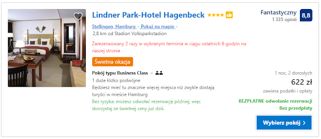 W okolicy Volksparkstadion proponujemy nocleg w obiekcie Lindner Park-Hotel Hagenbeck. Za pobyt na dobę dla jednej osoby zapłacimy 514 zł, a dla dwóch osób 622 zł.
