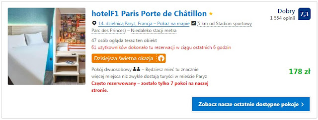 Proponujemy pobyt na jedną noc dla dwóch osób w dwóch obiektach nieopodal stadionu: hotelF1 Paris Porte de Chatillon za 178 zł (89 zł/os/noc) lub Campanile Paris Ouest – Pont de Suresnes za 211 zł (106 zł/os/noc).