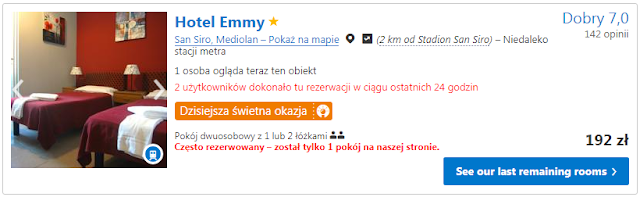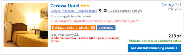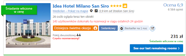Nocleg proponujemy w Hotelu Emmy lub Certosa Hotel lub Idea Hotel Milano San Siro, pokoje dwuosobowe z 1 lub 2 łóżkami w pobliżu Stadionu San Siro. Wysokooceniane przez użytkowników portalu Booking, cena za pokój od 192 zł ( ok. 96 zł za osobę za noc)
