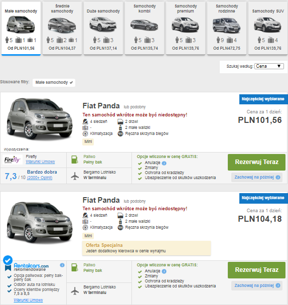 Wskazujemy na możliwość wynajęcia auta w naprawdę niskiej cenie bo od ok 102 zł za dzień. W przypadku grupy 2-4 osobowej cena wynajęcia samochodu jest prawie nieodczuwalna(26- 51 zł za osobę) . Wybierając tę opcję odchodzi nam transfer lotniskowy z lotniska w Bergamo do Mediolanu. Możemy zostawić i odebrać auto pod lotniskowym terminalem REZERWUJ====>
