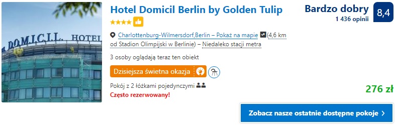 Proponujemy nocleg w Hotel Domicil Berlin by Golden Tulip gdzie za noc w pokoju dwuosobowym zapłacimy 290 zł ( 145 zł/os. – wliczony podatek miejski w wysokości 5,33%)