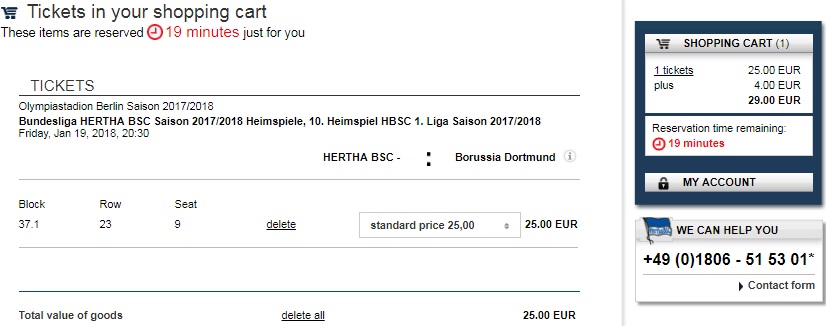 Bilet na mecz kupujemy na oficjalnej stronie Herthy Berlin => https://www.eventimsports.de/ols/hbsctk/en/tk/channel/shop/areaplan/venue/event/78763 gdzie dokonujemy wyboru miejsca z planu stadionu. Najtańsze wejściówki z opłatą manipulacyjną kosztują 29€ (ok. 125zł). Do zakupu biletu na stronie niezbędna jest bezpłatna rejestracja.