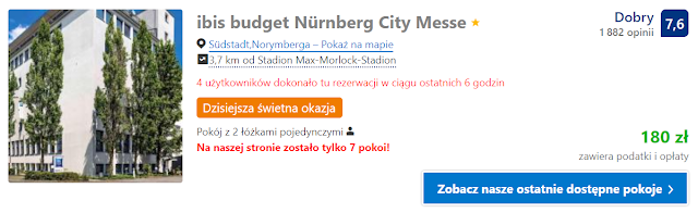 Dla fanów, którzy zdecydują się pozostać w Norymberdze na noc polecamy ibis budget Nürnberg City Messe. Nocleg w dniach 18-19 lutego kosztuje 180 zł za jedną oraz 234 zł (117 zł os./noc) za dwie osoby.