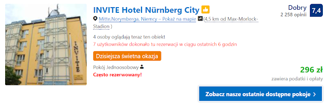 Dla fanów, którzy zechcą pozostać na noc w Norymbergi polecamy oddalony o 4,5 km od stadionu Max Morlock INVITE Hotel Nürnberg City. Koszt noclegu w dniach 22-23 grudnia wynosi 296 zł za pokój jednoosobowy oraz 339 zł (169,5 zł os./noc) za dwuosobowy.
