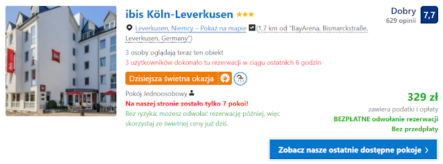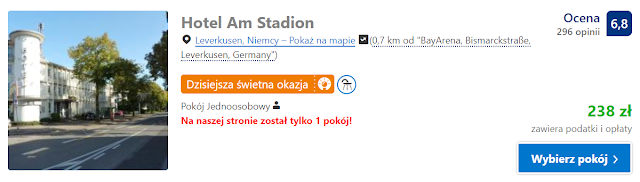 Polecamy obiekty, które znajdują się bardzo blisko stadionu Bay Arena. Pierwszy z nich to Hotel Am Stadion, gdzie za pokój jednoosobowy w dniach 23-24 listopada zapłacimy 238 zł. Alternatywą może być ibis budget Koeln Leverkusen City Hotele. Tutaj za nocleg w pokoju dwuosobowym zapłacimy 239 zł (119,5 zł os./noc).