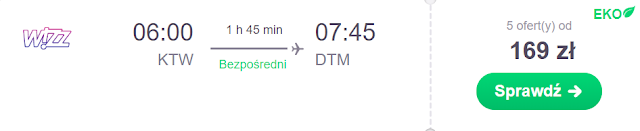 Lot powrotny warto zaplanować na 24 listopada. Za połączenie Dortmund – Wrocław zapłacimy 43 zł* (cena regularna 76 zł) REZERWUJ====>, natomiast koszt lotu z Dortmundu do portu lotniczego Olsztyn – Mazury wynosi 43 zł* (cena regularna 87 zł) REZERWUJ====>.