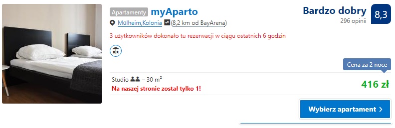 Proponujemy nocleg w dwóch obiektach wysoko ocenionych przez klientów. Pierwszym jest Hotel Pension Sudring położony blisko stadionu jednak bez prywatnej łazienki w pokoju. Za dwie noce w pokoju dwuosobowym zapłacimy tam 408 zł ( 102 zł/os./noc). Drugą propozycją jest myAparto, z prywatną łazienką jednak położony dalej od stadionu. Za dwie noce w pokoju dwuosobowym zapłacimy 416 zł (104 zł/ os./noc).