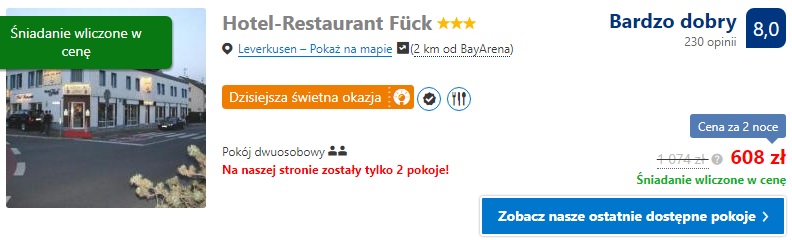 Proponujemy nocleg w obiektach położonych nieopodal BayArena tj. apartament Best Cologne gdzie za dwie noce w apartamencie dwuosobowym zapłacimy 516 zł (129 zł/os./noc). Drugą propozycją jest Hotel-Restaurant Fück gdzie za dwie noce w pokoju dwuosobowym zapłacimy 608 zł ( 152 zł/os./noc). W przypadku jednego noclegu w Hotel-Restaurant Fück zapłacimy o połowę mniej czyli 304 zł.