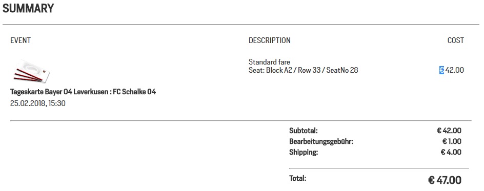 Bilet na mecz kupimy na oficjalnej stronie Bayer Leverskusen . Najtańsze wejściówki zaczynają się od 47€ (ok. 198 zł). W cenę wliczona jest dostawa biletu drogą pocztową. Zanim wybierzemy i zamówimy bilet, musimy zarejestrować się na stronie oraz zweryfikować konto w mailu zwrotnym REZERWUJ ==== >