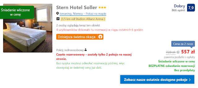 Dla fanów, którzy skorzystają z opcji noclegu polecamy pobyt w Stern Hotel Soller oddalony od stadionu Allianz Arena o 3,5 kilometra. Koszt pobytu w dniach 7-9 grudnia wynosi 557 zł za pokój jednoosobowy oraz 728 zł (182 zł os./noc) w dwuosobowym. Śniadanie wliczono w cenę.