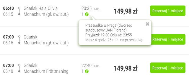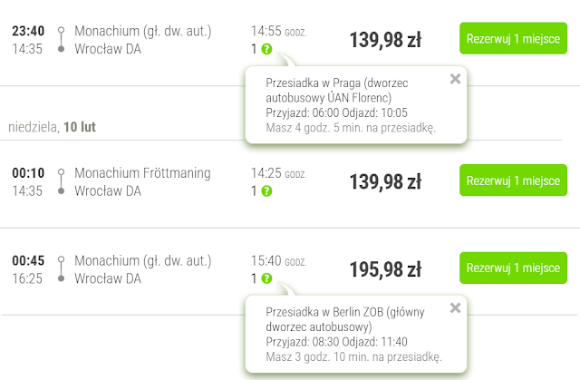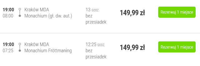 Alternatywnym środkiem transportu pozostaje Flixbus, którym do Monachium dojedziemy z Poznania od 140 zł REZERWUJ====>, Gdańska za 150 zł REZERWUJ====>, Krakowa za 150 zł REZERWUJ====>, Warszawy od 165 zł REZERWUJ====> oraz Wrocławia za 169 zł REZERWUJ====>.