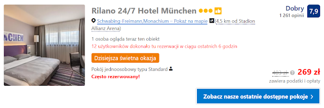 Kibice reflektujący pozostanie w Monachium na noc, oferujemy nocleg w Rilano 24/7 Hotel München. Cena za pobyt dla jednej i dwóch osób, to koszt kolejno 269 zł i 299 zł (149,5 zł os./noc).