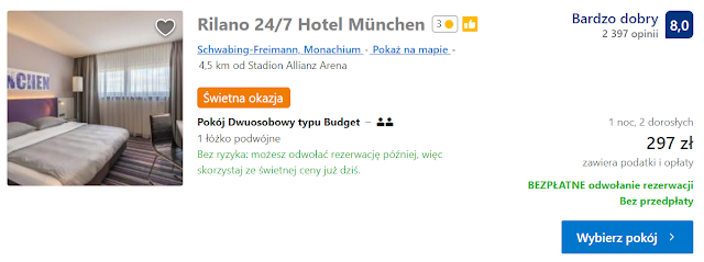 Dla Kibiców, którzy zamierzają pozostać w Monachium na noc polecamy Rilano 24/7 Hotel München, w którym koszt noclegu dla jednej i dwóch osób wynosi kolejno 267 zł oraz 297 zł (148,5 zł os./noc).
