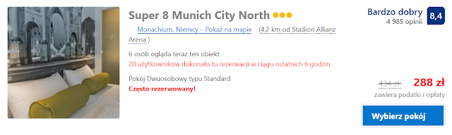Dla kibiców, którzy zdecydują się pozostać na noc w Niemczech proponujemy pobyt w dniach 27-28 stycznia w Super 8 Munich City North. Cena noclegu dla jednej i dwóch osób, to wydatek kolejno 378 zł (wraz ze śniadaniem) oraz 288 zł (144 zł os./noc).