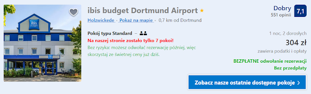 Fanom wybierającym połączenie lotnicze polecamy oddalony o 700 metrów od dortmundzkiego portu lotniczego ibis budget Dortmund Airport. Koszt noclegu w terminie 14-15 września dla jednej/dwóch osób wynosi kolejno 250 zł oraz 304 zł (152 zł os./noc).