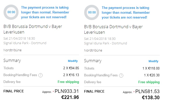 Obecnie najtańsze pojedyncze wejściówki na mecz zakupimy na rynku wtórnym za 582 zł REZERWUJ ==== >. W przypadku zakupu dwóch łączonych wejściówek zapłacimy 467 zł/os. REZERWUJ ==== >. UWAGA! Bilety mogą zostać dostarczone wyłącznie na terenie Niemiec. Należy poinformować znajomego lub hotel w którym będziemy nocować o nadejściu przesyłki. Nie przechodzimy na polską wersję (Stubhub) a pozostajemy w angielskiej wersji strony (ticketbis.net) – znajdziemy tam zdecydowanie tańsze bilety! Nie wykluczone, że w późniejszym terminie bilety pojawią się na oficjalnej stronie lub markecie Borussi Dortmund (na chwilę obecną nie mamy informacji).