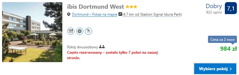 Proponujemy nocleg w ibis Dortmund West gdzie za dwie noce w pokoju dwuosobowym zapłacimy ok. 1100 zł z podatkiem miejskim ( ok. 275 zł os./noc). W przypadku jednej nocy proponujemy Hotel Senator gdzie za pokój dwuosobowy zapłacimy 584 zł ( 292 zł os./noc).
