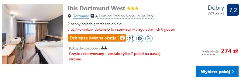 Proponujemy nocleg w dwóch obiektach położonych niedaleko stadionu. Pierwszym (niżej ocenionym przez klientów) obiektem jest Pension Kirchhoff gdzie za noc w pokoju dwuosobowym zapłacimy 259 zł ( ok. 130 zł/ os./ noc -w cenę wliczony podatek miejski 7,5 %). Drugą propozycją (wyżej ocenioną przez klientów) jest Ibis Dortmund West gdzie za noc w pokoju dwuosobowym zapłacimy ok. 315 zł ( ok. 158 zł/ os./noc- w cenę wliczony podatek miejski 7,5 %).