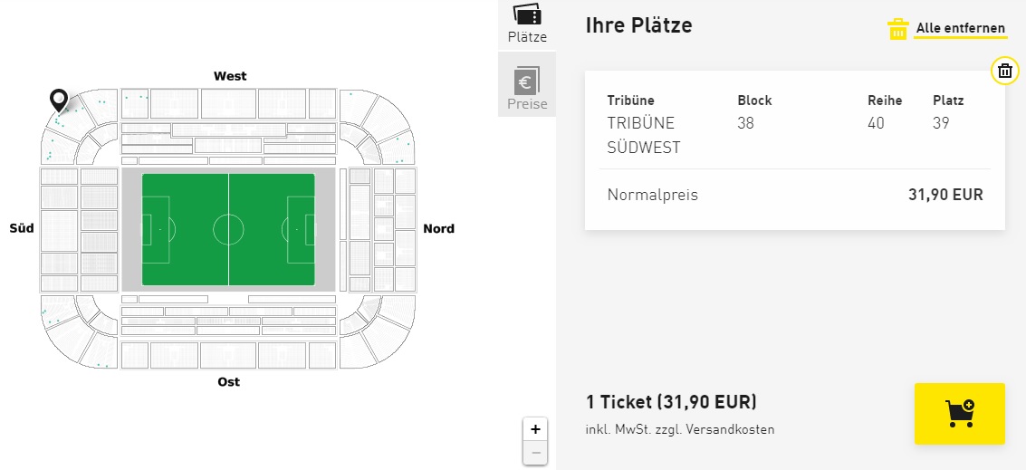 Wejściówki możemy zakupić na oficjalnej stronie Borussii Dortmund .Cena najtańszych biletów zaczyna się od 31,9 EUR wraz z opłatami manipulacyjnymi ( ok. 135 zł) REZERWUJ====> . Uwaga!!! Należy spieszyć się z zakupem ponieważ liczba miejsc jest ograniczona.