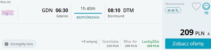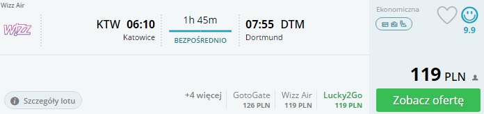 Wylot planujemy w dniu meczu bezpośrednio do Dortmundu z Krakowa za 39 zł (korzystając z oferty oficjalnej strony Ryanair) REZERWUJ ==== >, z Gdańska za 169 zł* (cena regularna 209 zł) REZERWUJ ==== > oraz Katowic za 74 zł* (cena regularna 119 zł) REZERWUJ ==== >
