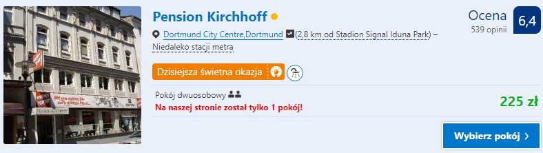Proponujemy nocleg w dwóch obiektach położonych niedaleko stadionu. Pierwszym (niżej ocenionym przez klientów) obiektem jest Pension Kirchhoff gdzie za noc w pokoju dwuosobowym zapłacimy 259 zł ( ok. 130 zł/ os./ noc -w cenę wliczony podatek miejski 7,5 %). Drugą propozycją (wyżej ocenioną przez klientów) jest Ibis Dortmund West gdzie za noc w pokoju dwuosobowym zapłacimy ok. 315 zł ( ok. 158 zł/ os./noc- w cenę wliczony podatek miejski 7,5 %).