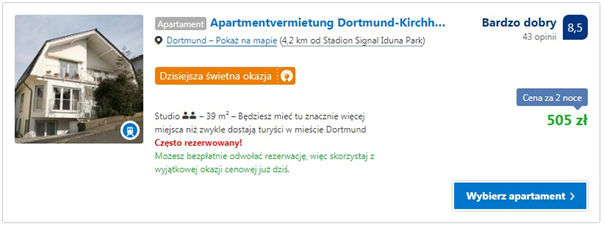 Nocleg proponujemy w miejscach położonych w pewnej odległości od centrum miasta i stadionu. Najtańszą opcją może być Gästehaus Dortmund, w tym wypadku dwie noce dla dwóch osób to koszt 416 zł (ok. 104 zł/os/noc). Za dwie noce dla dwóch osób w Apartmentvermietung Dortmund-Kirchhörde zapłacimy 505 zł (ok. 126 zł/os/noc). Nieco droższą opcją jest ibis Dortmund West, gdzie dwuosobowy pokój dla 2 osób to koszt 545 zł (ok. 136 zł/os/noc).