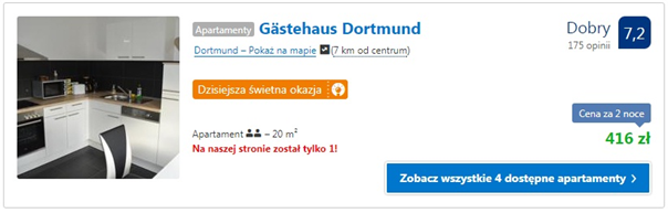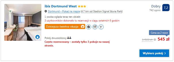 Nocleg proponujemy w miejscach położonych w pewnej odległości od centrum miasta i stadionu. Najtańszą opcją może być Gästehaus Dortmund, w tym wypadku dwie noce dla dwóch osób to koszt 416 zł (ok. 104 zł/os/noc). Za dwie noce dla dwóch osób w Apartmentvermietung Dortmund-Kirchhörde zapłacimy 505 zł (ok. 126 zł/os/noc). Nieco droższą opcją jest ibis Dortmund West, gdzie dwuosobowy pokój dla 2 osób to koszt 545 zł (ok. 136 zł/os/noc).