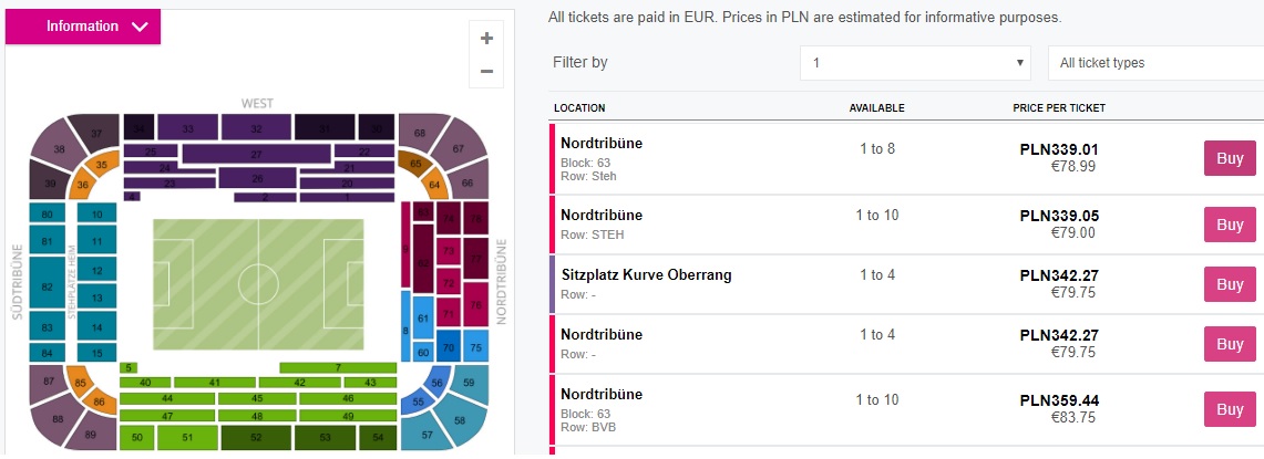 Na chwilę obecną na oficjalnej stronie Borussi, nie można zakupić biletów. Prawdopodobnie sprzedaż otwarta ruszy na kilka dni przed meczem, a ceny biletów według informacji na stronie będą zaczynać się od ok. 18 € (ok. 80 zł). Na dzień dzisiejszy bilety dostaniemy na rynku wtórnym, gdzie cena za najtańsze bilety zaczyna się od 402 zł. REZERWUJ====>