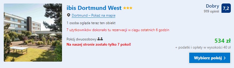 W przypadku dwóch noclegów proponujemy obiekt Haus Hohenstein, położony kilka kilometrów od stadionu, ale zdecydowanie najtańszy obiekt, z dobrymi opiniami gdzie za dwie noce w pokoju dwuosobowym zapłacimy 724 zł (181 zł/os./noc). W przypadku jednego noclegu proponujemy ibis Dortmund West gdzie za noc w pokoju dwuosobowym zapłacimy 574 zł (287 zł/os./noc- w cenę wliczyliśmy dodatkowe opłaty).