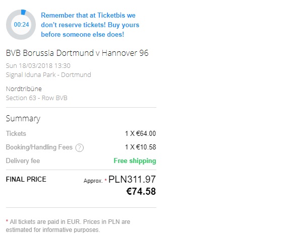 Jeżeli bilety na oficjalnej stronie BVB będą niedostępne możemy skorzystać z rynku wtórnego gdzie za najtańszą wejściówkę zapłacimy ok. 312 zł REZERWUJ ==== >. Bilety dostarczane są wyłącznie na terenie Niemiec dlatego należy poinformować hotel lub znajomego u którego będziemy nocowali o nadejściu przesyłki.