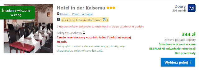 Chętni pozostający w Niemczech na noc proponujemy Hotel in der Kaiserau, gdzie za pobyt w pokoju jednoosobowym zapłacimy 344 zł, natomiast za dwuosobowy 494 zł (247 zł os./noc). W cenę wliczono śniadanie.