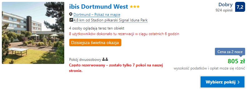 Nocleg w terminie 8-10 marca proponujemy zarezerwować w ibis Dortmund West gdzie za dwie noce w pokoju dwuosobowym zapłacimy 805 zł ( ok. 201 zł/os./noc). W przypadku jednego noclegu w tym samym obiekcie w pokoju dwuosobowym zapłacimy 402 zł (201 zł/os.).