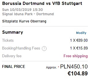 Obecnie najtańsze wejściówki dostaniemy za pośrednictwem rynku wtórnego. Ich cena zaczyna się od ok. 450 zł REZERWUJ====>. Większość biletów wysyłanych jest wyłącznie na terenie Niemiec. Zalecamy powiadomić hotel lub znajomego, u którego będziemy nocowali o nadejściu przesyłki. Prawdopodobnie na stronie Borussi Dortmund w późniejszym terminie, będziemy mieli możliwość zakupienia wejściówek. Na chwilę obecną nie ma informacji o sprzedaży biletów.