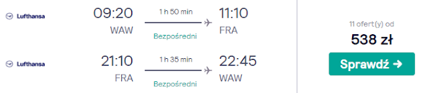 Tanimi liniami lotniczymi na główne lotnisko we Frankfurcie dotrzemy jedynie z Krakowa, wylatując dzień przed meczem i wracając dzień po meczu, a za bilety lotnicze zapłacimy 95 zł REZERWUJ====>. Alternatywą z innych polskich miast jest skorzystanie z droższych linii – np. za loty w tym samym terminie Lufthansą z Warszawy do Frankfurtu zapłacimy 538 zł REZERWUJ====>.