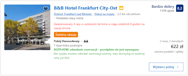 W centrum miasta w terminie 24-26 stycznia możemy się zatrzymać w B&B Hotel Frankfurt City-Ost. Za pokój jednoosobowy na dwie noce zapłacimy 520 zł, a za dwuosobowy 622 zł.