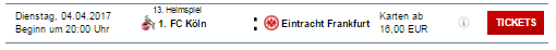 Bilety na mecz dostaniemy przez oficjalną stronę FC Köln https://www.eventimsports.de/ols/fckoeln/?&utm_campaign=startseite_klein. W tej chwili najtańsze bilety są w cenie 33 EUR (ok. 143 zł )