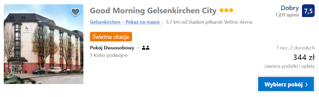 Pierwszym obiektem, który Wam przedstawiamy do oddalony o niecałe 6 km od Veltins-Areny Good Morning Gelsenkirchen City. Kwota za jednodniowy nocleg wynosi 302 zł za pokój jednoosobowy oraz 344 zł za pokój dwuosobowy (172 zł os./noc).