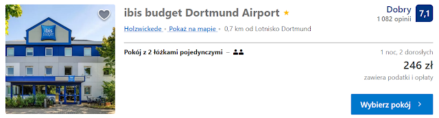 Proponujemy oddalony 700 metrów od lotniska w Dortmundzie ibis budget Dortmund Airport. Koszt jednodniowego noclegu wynosi 195 zł za jedną oraz 246 zł za dwie osoby (123 zł os./noc).
