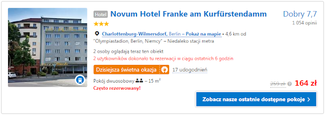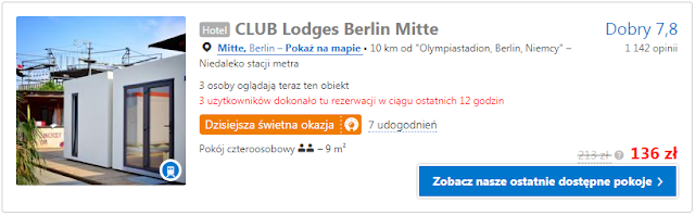 Ewentualny nocleg proponujemy w oryginalnym obiekcie CLUB Lodges Berlin Mitte gdzie za nocleg zapłacimy 136 zł za dobę (przeznaczony jest nawet dla czterech osób!). Druga propozycja to hotel trzygwiazdkowy Novum Hotel Franke am Kurfürstendamm w cenie 164 zł za pokój dwuosobowy ( 82 zł za osobę za noc)