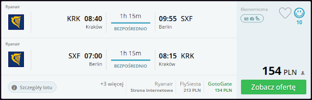 Proponujemy wylot z Krakowa do Berlina w dniu meczu 03.12 i powrót dzień po meczu 04.12 za 154 zł w dwie strony REZERWUJ====>