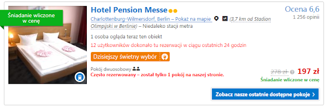 – Hotel Atrium Charlottenburg – położony o 4.3 km od Olympiastadion, blisko stacji metra, wysokooceniany obiekt przez użytkowników (średnia 7,5), możliwość pojedynczych łóżek, pokój dwuosobowy w hotelu 3* ze śniadaniem wliczonym w cenę za 254 zł
