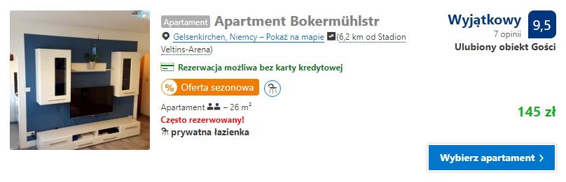 W wybranym terminie proponujemy noclegi w dwóch obiektach umiejscowionych w okolicach stadionu i miasta Essen. Pierwszym, zlokalizowany bliżej stadionu obiektem jest Apartment Bokermühlstr gdzie za noc w pokoju dwuosobowym zapłacimy 232 zł( 116 zł os./noc- w cenę wliczyliśmy usługę sprzątania). Drugim, nieco oddalonym od stadionu obiektem jest Petul Apart Hotel Ernestine gdzie za noc w pokoju dwuosobowym zapłacimy 230 zł (115 zł os./noc).