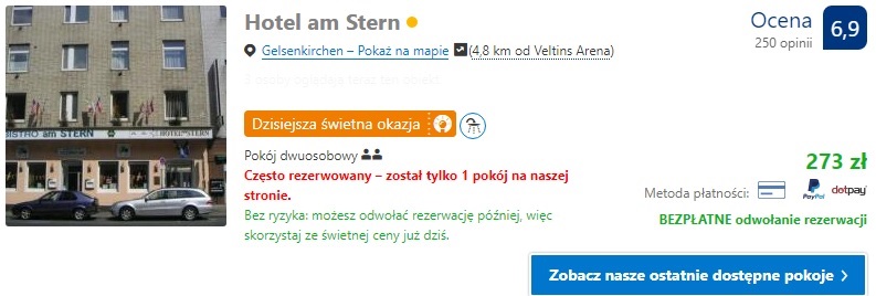 Nocleg, zarówno w przypadku noclegu 14-15 kwietnia lub 15-16 kwietnia proponujemy w Hotel am Stern położony niedaleko stadionu gdzie za pokój dwuosobowy zapłacimy 273 zł (ok. 137 zł os./noc)