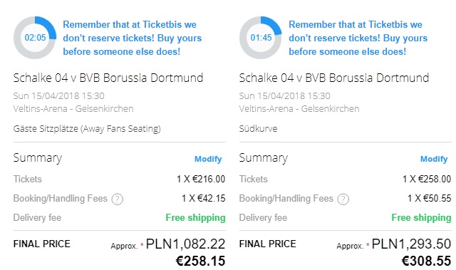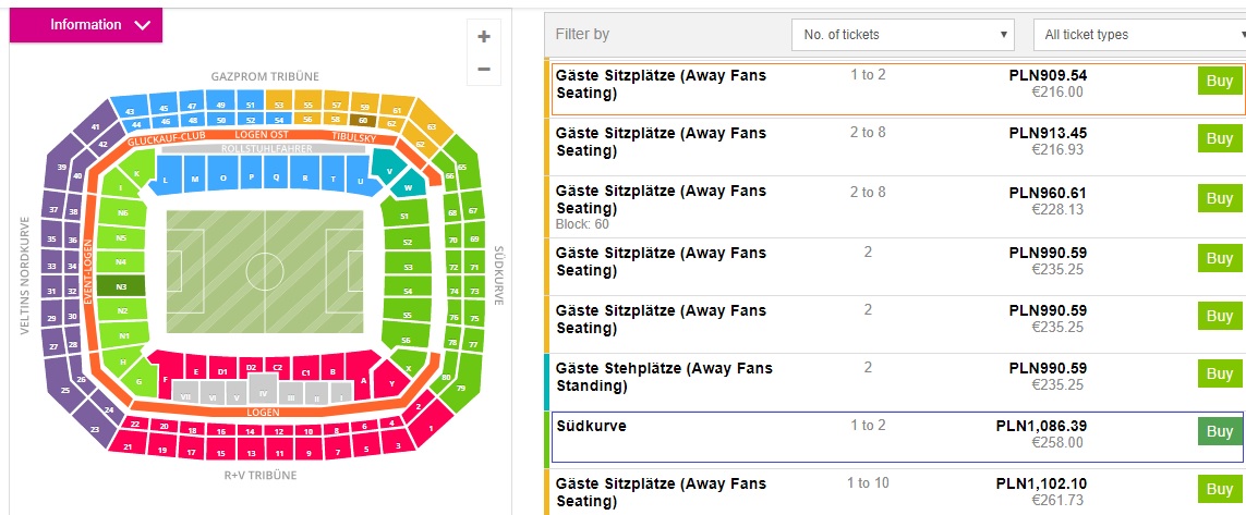 Bilety na mecz zakupimy na rynku wtórnym. Mamy do wyboru tańsze bilety na trybunie gości z Dortmundu za ok. 1082 zł REZERWUJ ==== > lub droższe na trybunach gospodarzy za ok. 1294 zł REZERWUJ ==== > . W przypadku zakupu biletów dla dwóch osób za najtańsze wejściówki w sektorze gości zapłacimy ok. 826 zł/os. UWAGA! Bilety mogą zostać dostarczone wyłącznie na terenie Niemiec. Należy poinformować znajomego lub hotel w którym będziemy nocować o nadejściu przesyłki. Nie przechodzimy na polską wersję (Stubhub) a pozostajemy w angielskiej wersji strony (ticketbis.net) – znajdziemy tam zdecydowanie tańsze bilety!