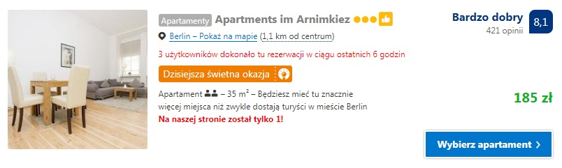 Nocleg podczas tak krótkiego pobytu nie dla każdego jest opcją konieczną jeśli jednak ktoś chce z korzystać z bazy noclegowej w Berlinie proponujemy bardzo dobrze oceniany apartament Apartments Im Arnimkiez w niedalekiej odległości od centrum Berlina za 185zł (92,5zł/os/noc).