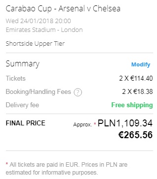 Bilety na mecz do kupienia na rynku wtórnym. Przy kupnie dwóch biletów, jeden możemy dostać już za ok. 555zł. Warto pamiętać, że bilet może być dostarczony tylko na terenie UK, w związku z czym należy uprzedzić hotel o nadejściu przesyłki, bądź znajomego u którego będziemy nocować podczas pobytu w Anglii. Uwaga! Nie przechodzimy na polską wersję (Stubhub) a pozostajemy w angielskiej wersji strony (ticketbis.net) – znajdziemy tam zdecydowanie tańsze bilety! REZERWUJ====>