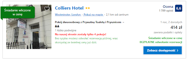 W centrum Londynu sugerujemy nocleg w Colliers Hotel. Obiekt ten również zapewnia śniadanie w ramach pobytu, a koszty to 392 zł za osobę i 414 zł za dwie osoby.