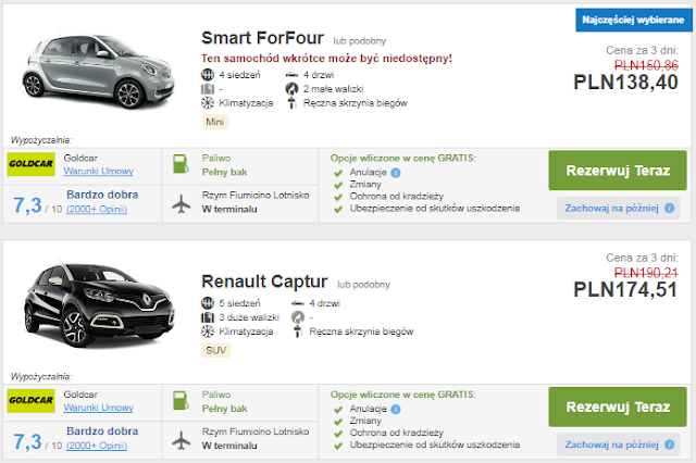Dobrym rozwiązaniem będzie wynajęcie auta w stolicy Włoch. Ceny za wynajem za 3 dni wydają się niewielkim kosztem w porównaniu do kosztów komunikacji miejskiej. Dodatkowo auto możemy odebrać i zostawić na lotnisku – oszczędzi nam to transferów lotniskowych. Cena za 3 dni wynajęcia auta czteroosobowego to koszt rzędu ok 138 zł ( w przypadku 2 osób daje koszt ok 23 zł za osobę za dzień) REZERWUJ====>