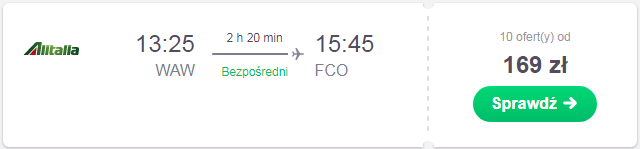 Możemy również wybrać się na mecz w dniu rozgrywanego spotkania 31.10 z portu Warszawa Chopin do portu Rzym Fumicino za 104 zł* (cena regularna 149 zł) REZERWUJ====> lub z Warszawa Chopin liniami Alitalia do portu Rzym Fumicino za 169 zł (cena dla wszystkich) REZERWUJ====>