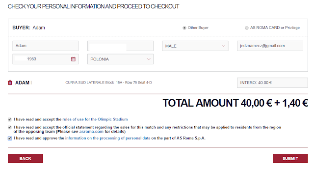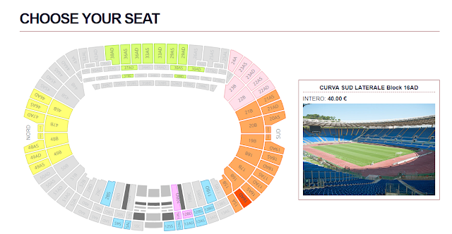 Bilety na mecz dostaniemy na oficjalnej stornie AS Roma. Najtańsze bilety dostaniemy już od 40 EUR +1,4 EUR opłaty manipulacyjnej(ok. 176 zł) REZERWUJ====>